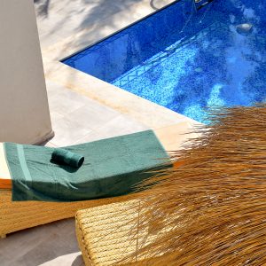 À l’extérieur, la piscine privée se déploie dans un écrin de calme, entourée d’espaces de détente baignés de soleil. C’est l’endroit idéal pour savourer des moments suspendus, un petit-déjeuner ombragé ou un verre au coucher du soleil.