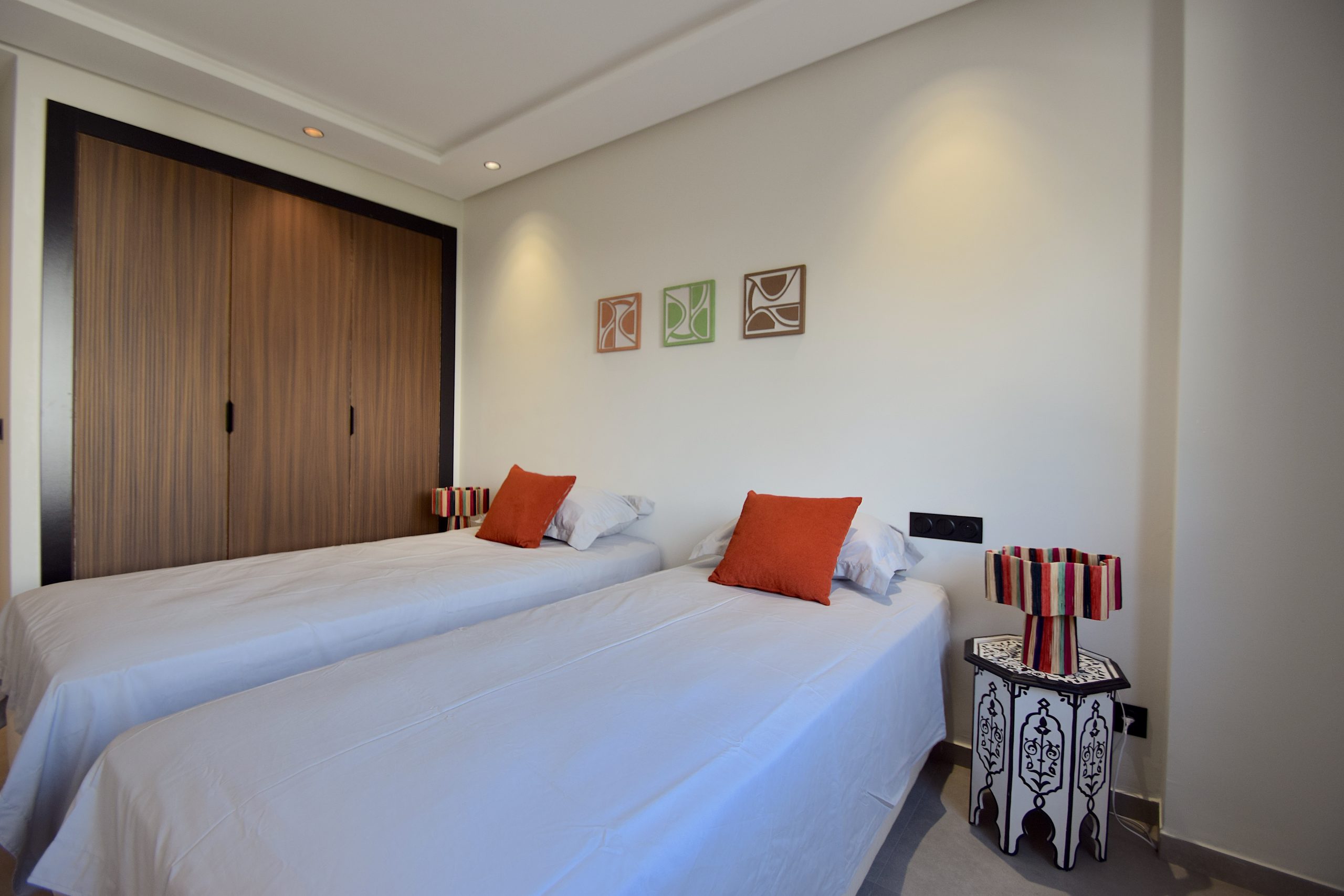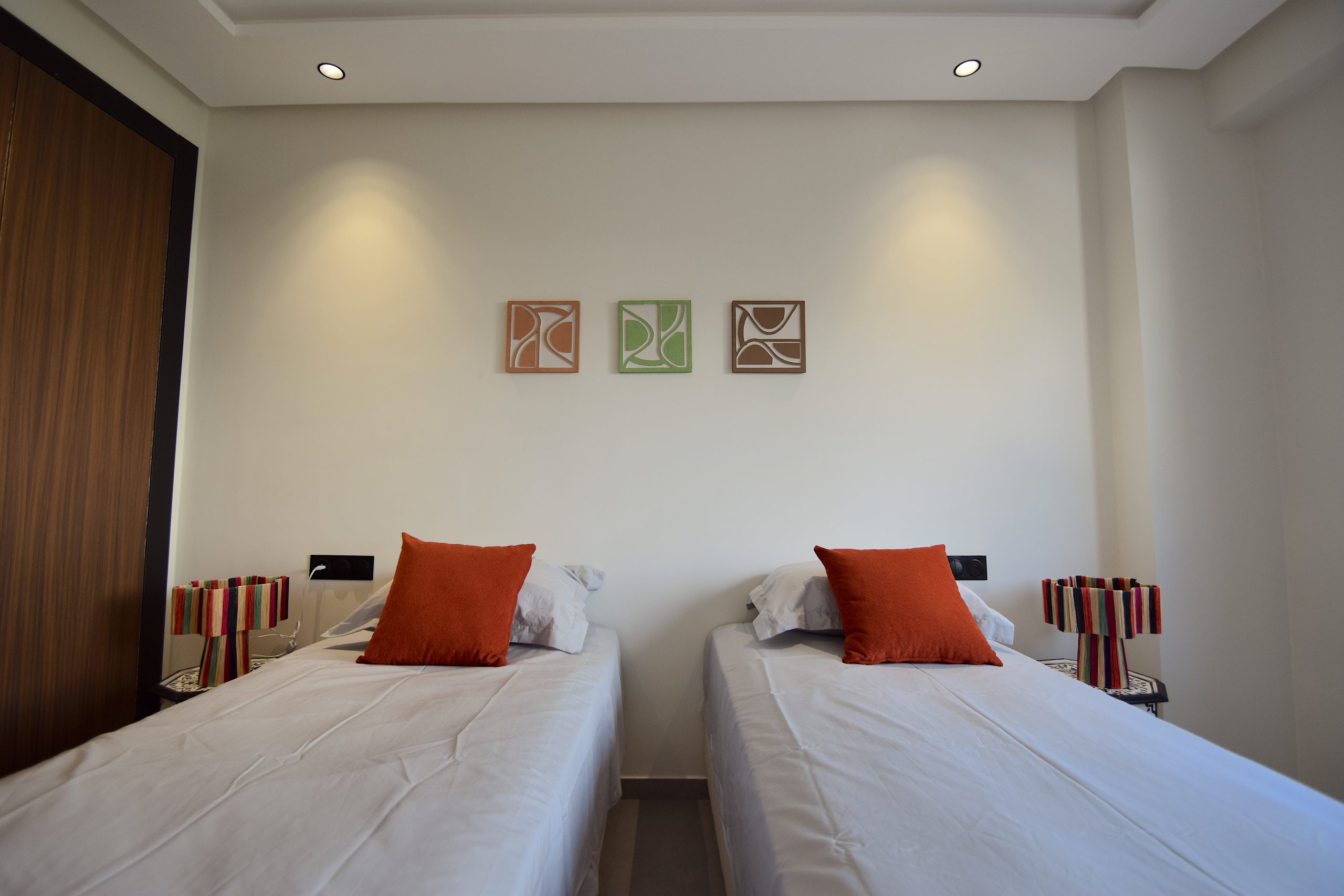 Chambre 2 : configuration 2 lits simples (modulables en lit double sur demande), placard intégré.