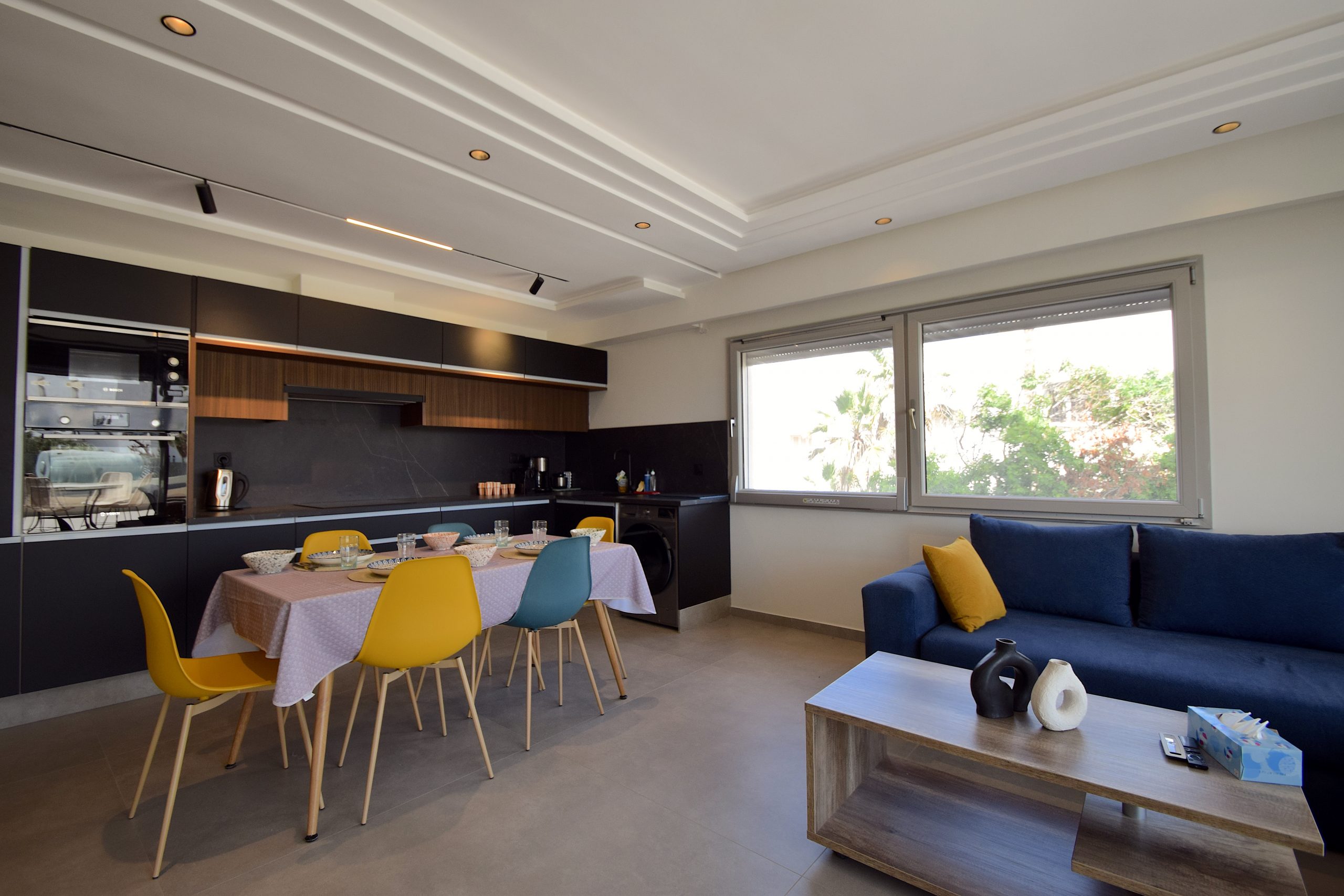 Salon / salle à manger / cuisine ouverte –> Grand espace de vie baigné de lumière naturelle grâce aux baies vitrées qui donnent directement sur la terrasse. Canapé d’angle confortable, TV connectée, table à manger pour 4 à 6 personnes. Cuisine entièrement équipée (plaques, four/micro-ondes, frigo, lave-linge, cafetière Nespresso, cafetière filtre, théière, vaisselle complète).