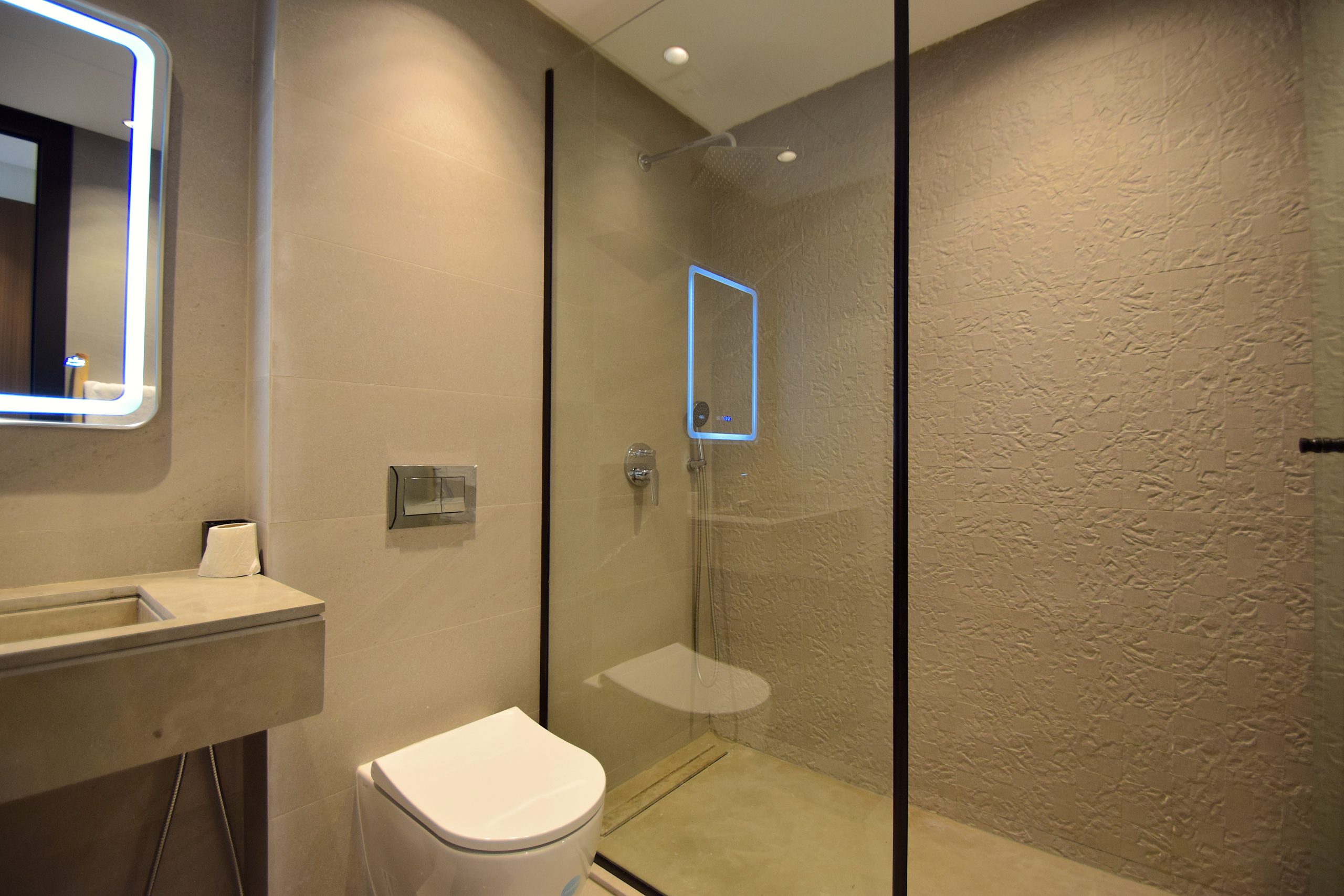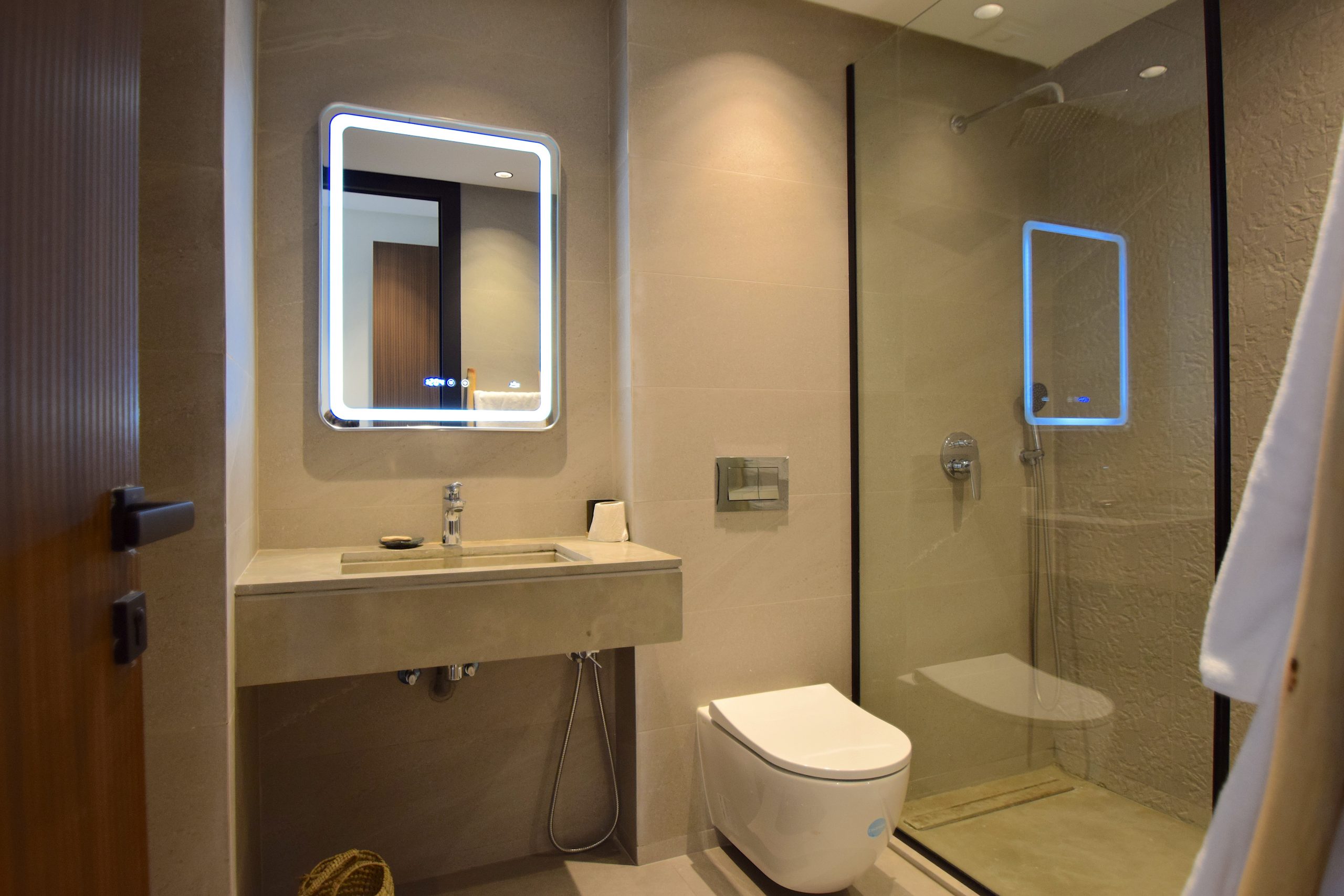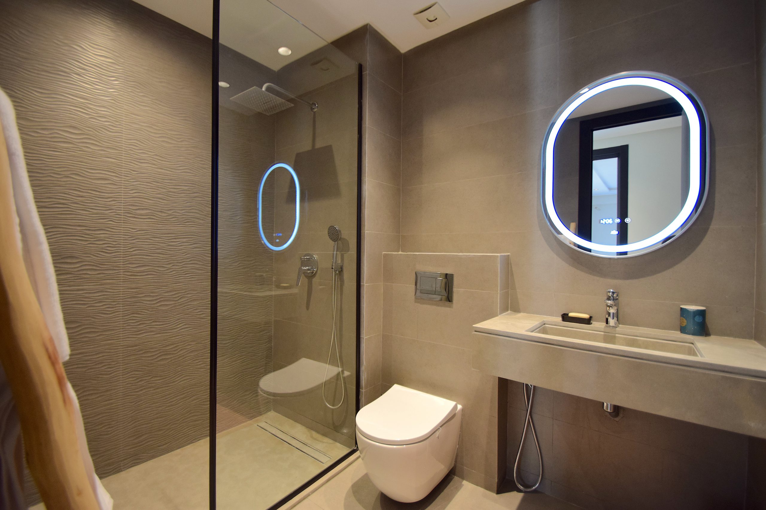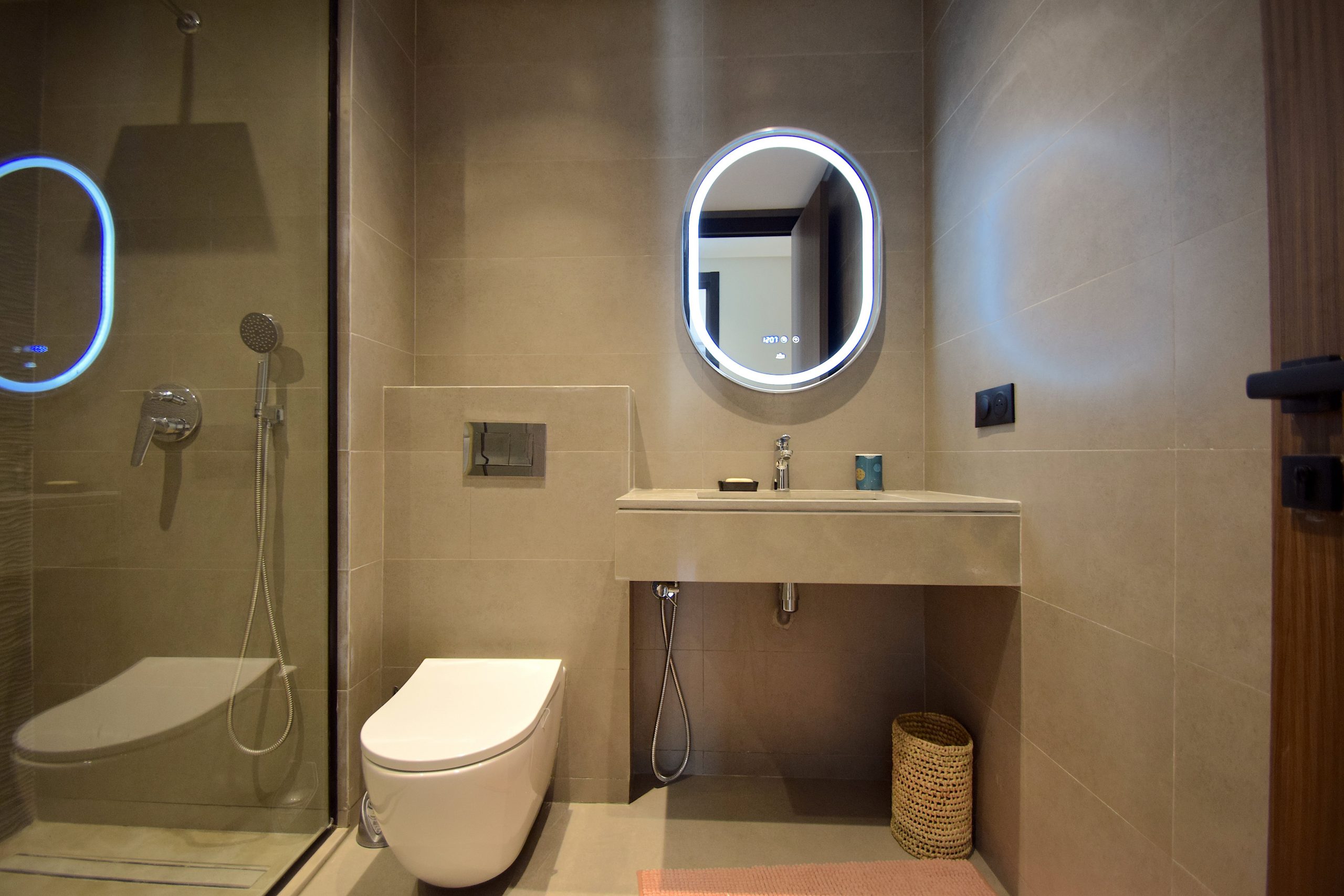 Salle de bain 1 : douche à l’italienne avec paroi vitrée, WC suspendu, vasque design, miroir LED tactile, sèche-cheveux fourni.