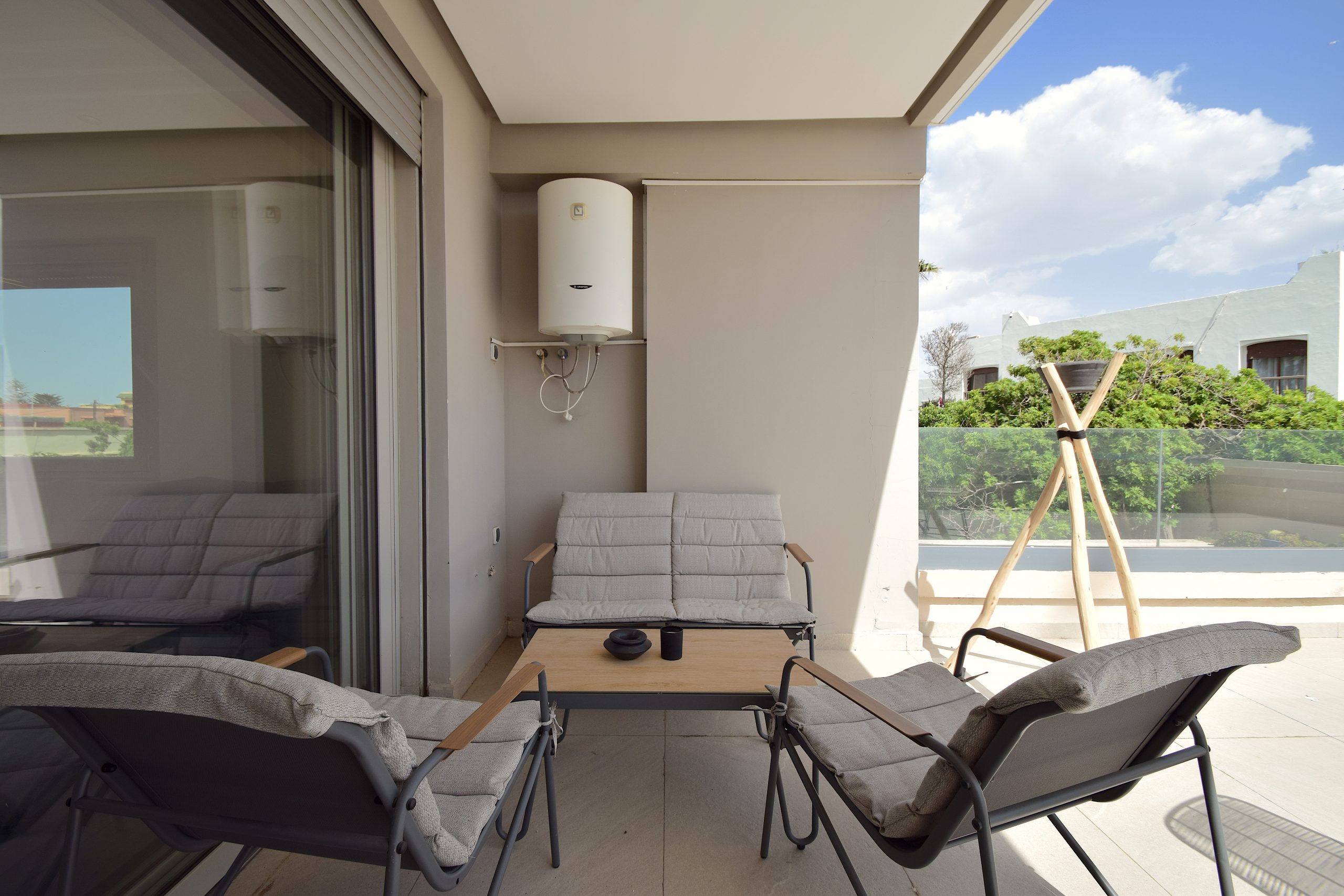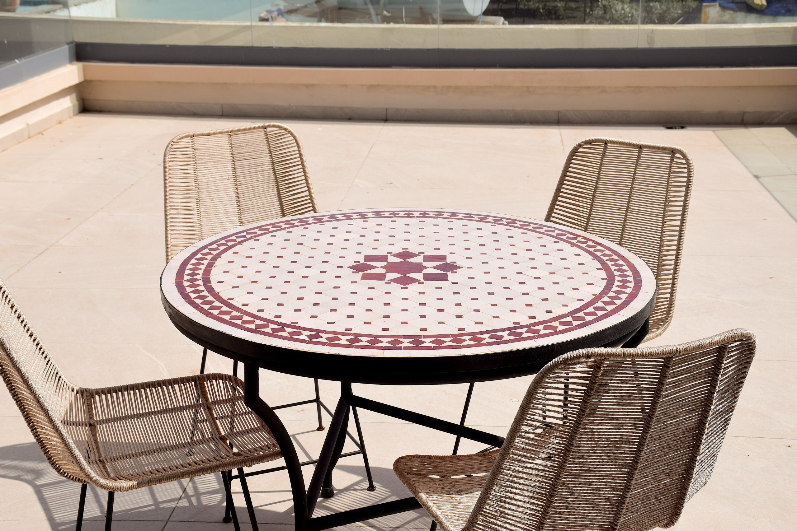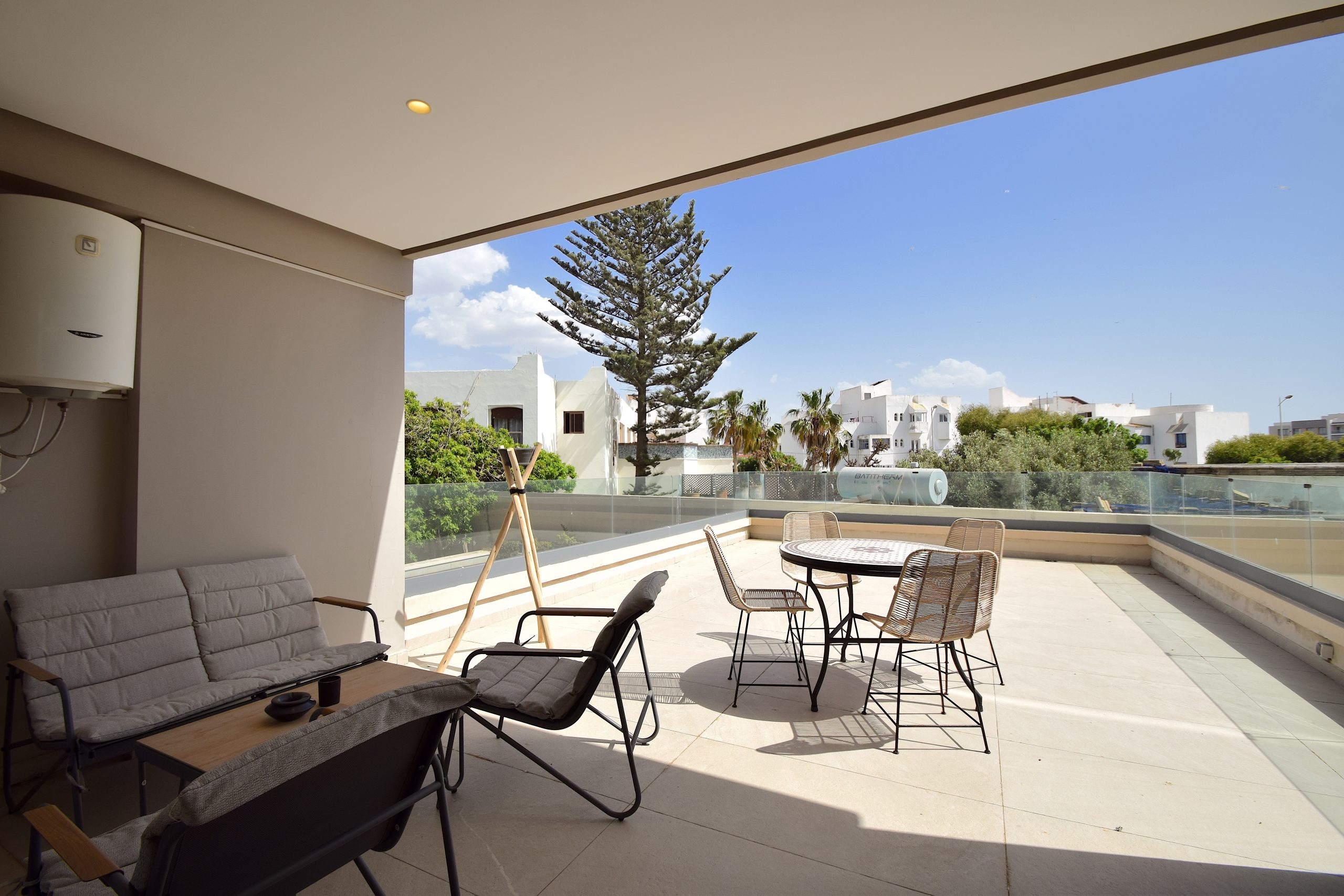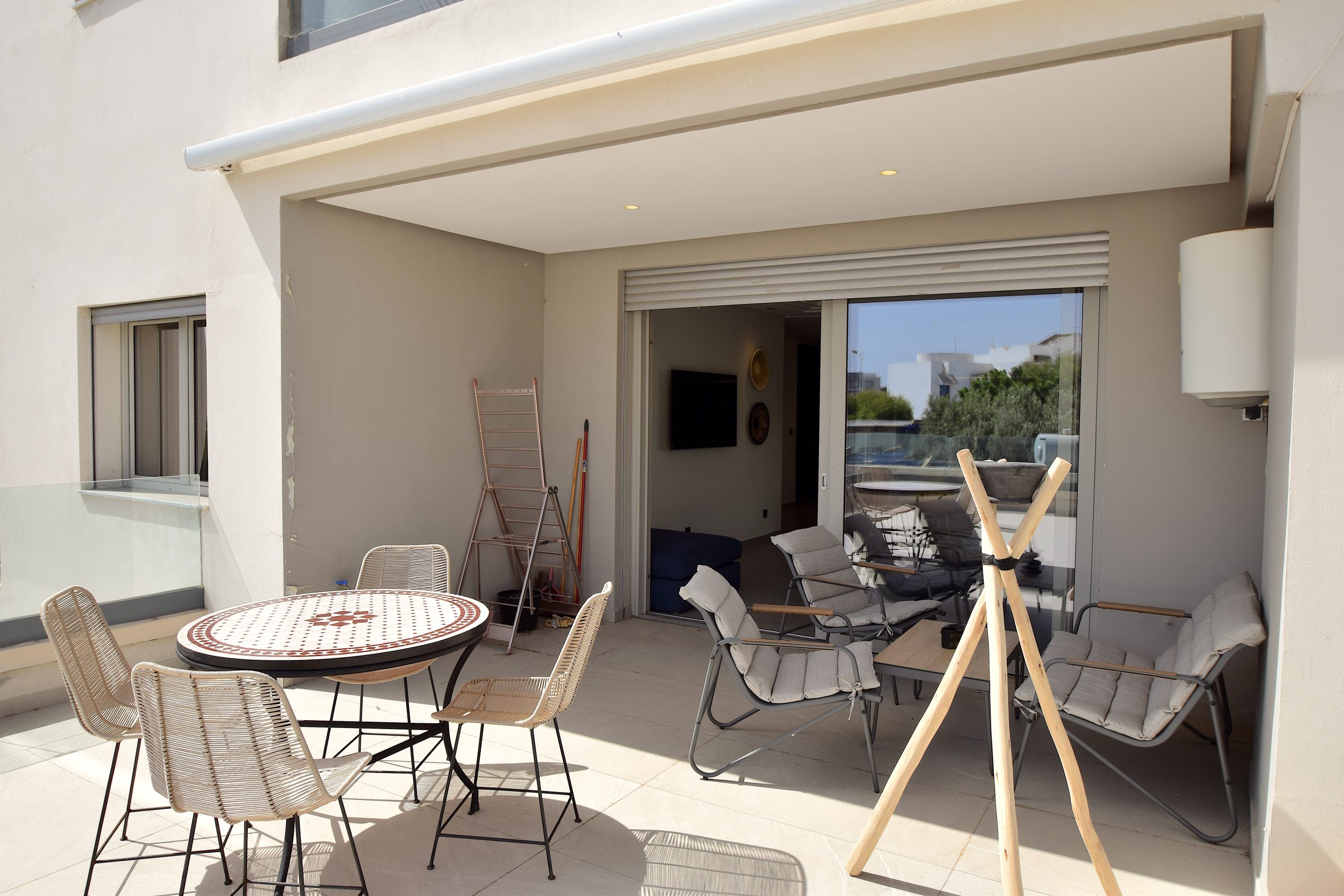 Terrasse 50 m² : LE point fort : table repas extérieure, coin lounge, store banne, vue dégagée. Parfaite pour les soirées tagine ou un thé à la menthe au lever du soleil.